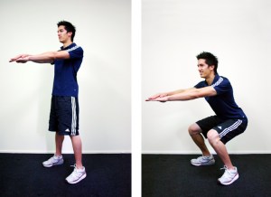 • ধীরে ধীরে হাঁটু সামনের দিকে হিপ সহ ভাঙ্গতে থাকুন ও মেঝের দিকে নামতে থাকুন| মনে করুন আপনি পা ফাঁক করে চেয়ারে বসতে যাচ্ছেন(ছবি ২ এর মতো)|