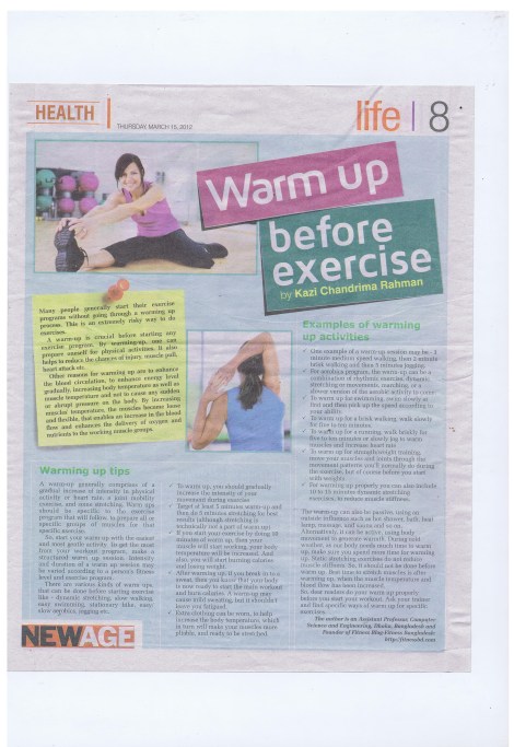 প্রিয় পাঠক, আজকের দৈনিক পত্রিকা নিউএইজে দেখুন আমার লেখা–“Warm up before exercise”| এই পত্রিকার লাইফ মাগাজিনের পৃষ্ঠা ৮ এ আমার লেখাটি পাবেন|